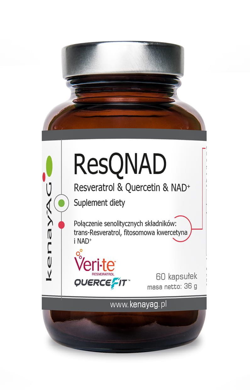 Prehransko dopolnilo Kenay Kvercetin Resveratrol NAD+ ResQNAD je kombinacija senolitičnih sestavin: trans-resveratrola, fitosomskega kvercetina in NAD+