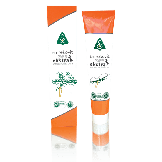 Smrekova hladilna krema Smrekovit 365 Ekstra je 100% naravna krema s smrekovo smolo. Poleg smole vsebuje tudi kafro in mentol, ki imata rahlo anestetičen in hladilni učinek. Smola iglavcev je dobro poznana v ljudskem zdravilstvu, njene števile učinke pa potrjujejo tudi naše dolgoletne izkušnje. Smola spodbuja delovanje in prekrvavitev kože, jo neguje površinsko in globinsko ter krepi njen obrambni mehanizem.