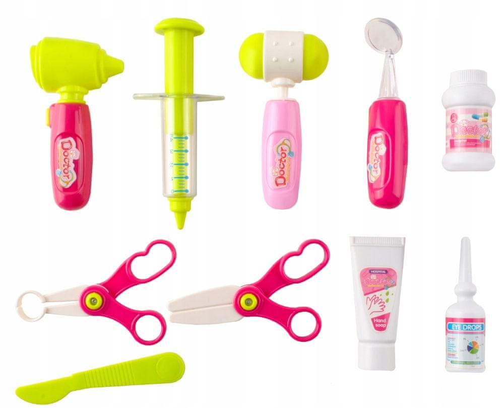 Nadzorni zaslon ima različne zvočne gumbe, ki med delovanjem oddajajo zvoke kot prava naprava, npr. Barvite svetleče diode dodajo izdelku privlačnost .Ob pritisku stetoskop zapiska in lučka v obliki srca zasveti. Termometer in merilnik srčnega utripa imata drsnik za prilagajanje meritev in svetleč zaslon. Otoskop in zobno ogledalo sta opremljena z osvetlitvijo.Elementi so skrbno izdelani iz zdravju varnih materialov. Imajo gladke robove in njihova oblika omogoča enostaven oprijem in trdno držanje v roki.Komplet bo odpravil dolgčas in vam omogočil spoznavanje človeškega telesa. Spodbudila bo domišljijo, vas seznanila s poklicem zdravnika in ozavestila, da je treba skrbeti za svoje zdravje. Otrok lahko igra vlogo zdravnika ali pacienta ter z igro z drugimi v skupini razvija socialne in integracijske sposobnosti.
