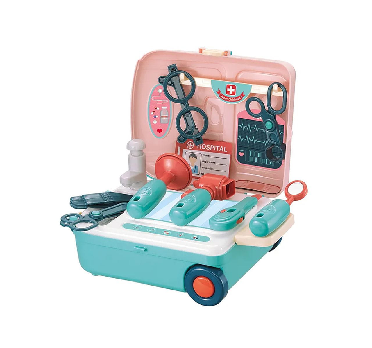 Medicinski kovček z dodatki za igro zdravnika. Možnost pripetja priloženih naramnic na kovček. Predmeti brez ostrih robov, ki so primerni za otroško roko. Celoten opis