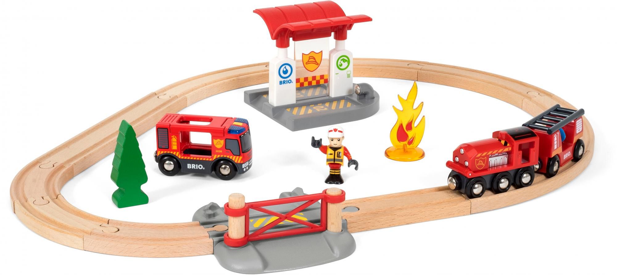 Brio komplet – gasilec vsebuje gasilsko postajo, vlak, gasilsko vozilo ter tirnice, ki jih je mogoče tudi razširiti. Gasilsko vozilo ima vizualne ter avdio učinke. Igrača je primerna za otroke od 3. let starosti dalje. Celoten opis