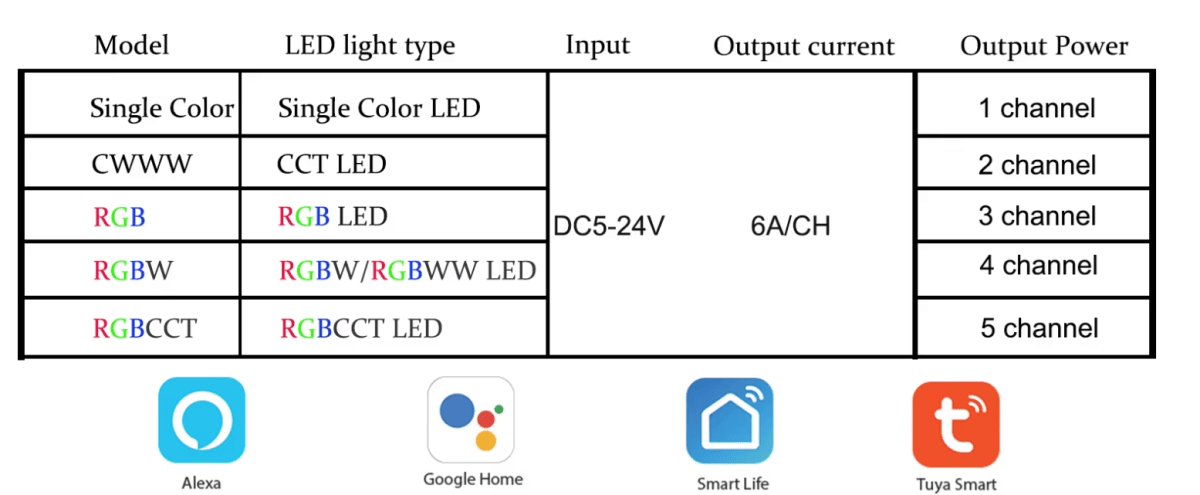 - Podpira do 5 kanalov za različne vrste trakov LED (RGB, RGBW)