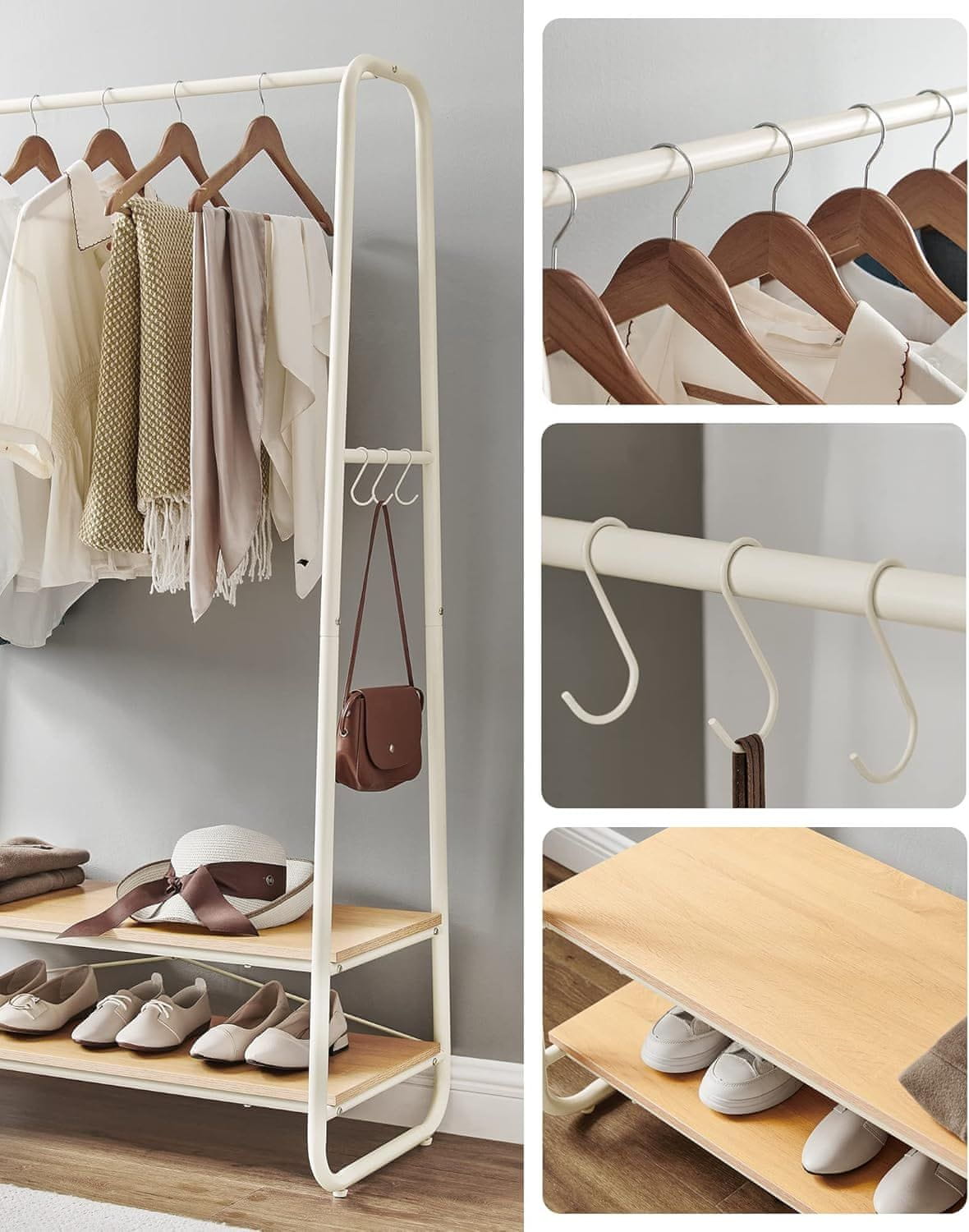 Večnamenski obešalnik je idealen za hodnik, spalnico ali vhodni prostor. S stojalom s palico, dvema policama in šestimi kavlji v obliki črke S ponuja vsestranski prostor za shranjevanje oblačil, čevljev, torbic in drugih dodatkov. Celoten opis