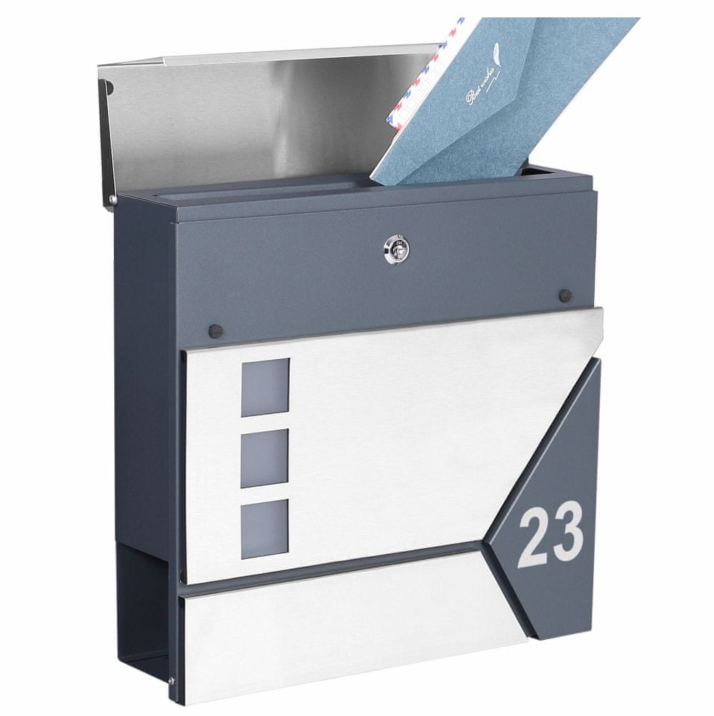MODEREN IN PRAKTIČEN POŠTNI NABILNIK – Dizajnerski stenski poštni nabiralnikPoštni nabiralniki MAILBOX vrhunske kakovosti iz pocinkane jeklene pločevine in prašno barvanje po RAL. S cilindrično ključavnico in 2 ključema, sprednja stran v videzu kombinacije antracit & inox,ohišje v antracitni barvi z integriranim predalom za časopise/kolotom. Poštni nabiralnik je stilsko dovršen nabiralnik, posebnost nabiralnika je v sami kvalitetni izdelavi in modernemu stilu, preprostosti in ravnih linijah ter izogibanju pretiranega okraševanja.