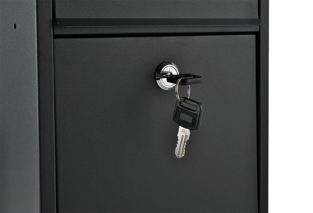 V kompletu sta dva ključa , tako da ni treba dodati dodatnega izvoda, če škatlo uporablja več kot ena oseba. Nabiralnik ima tudi posebne luknje za pritrditev . S priloženimi stenskimi vložki ga le privijte na površino, na katero boste končno postavili.