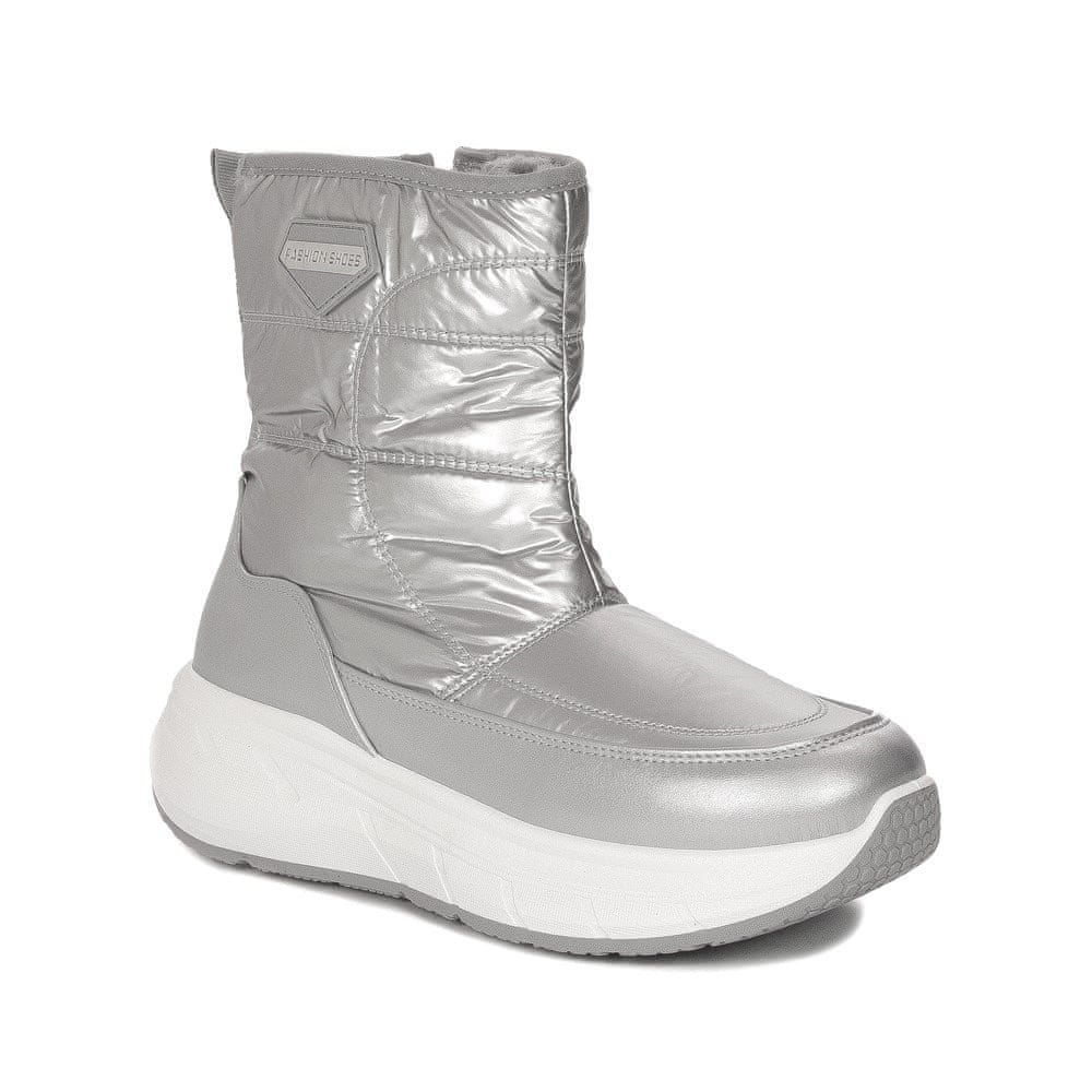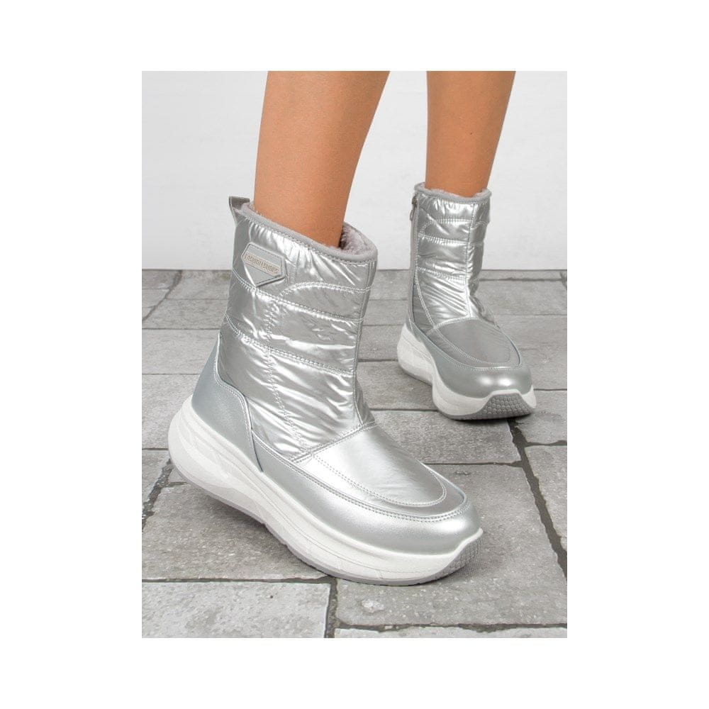 Filippo je blagovna znamka, katere kolekcije so zasnovane za elegantne ženske, ki želijo vedno izgledati popolno, ne glede na priložnost. Predstavljamo najnovejši model blagovne znamke za jesensko-zimsko sezono. Zgornji del je izdelan iz visokokakovostnega materiala v barvi „Silver“. Ti snežni škornji se na notranji strani zapenjajo z zadrgo. Okrogla konica daje vašim prstom veliko svobode in omogoča udobno pozicioniranje. Mehka in udobna notranjost iz toplega flisa nežno ovije in greje vaša stopala ter zagotavlja občutek udobja. Ta model ima 5 cm platformo. Idealen za obleke, krila in hlače. Širina, ki jo je določil proizvajalec – G.