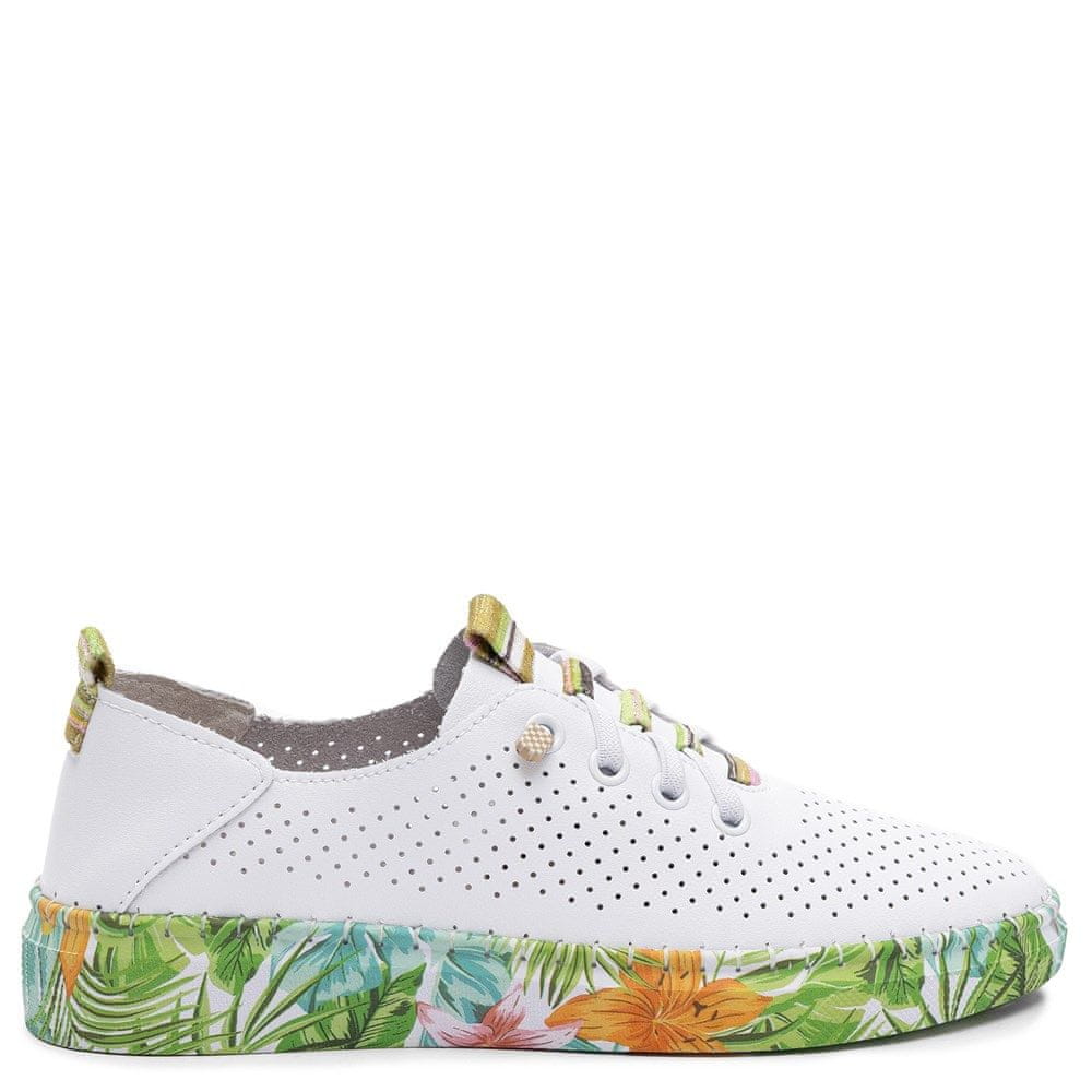 Iščete obutev, ki združuje ročno izdelavo, edinstven dizajn in neverjetno udobje? Artiker 58C0441 je bistvo poletnega stila, ustvarjen za ženske, ki se ne želijo odločati med estetiko in zdravjem svojih stopal. Te bele usnjene superge pritegnejo pozornost ne le z neokrnjeno belino naravnega usnja, temveč predvsem s svojim spektakularnim, barvitim podplatom z motivom tropskega cvetja in listov. So popolna izbira za tiste, ki cenite poljsko proizvodnjo in želite svoji garderobi dodati kanček vesele energije. Zahvaljujoč uporabi mehkega, perforiranega usnja ta model zagotavlja vašim stopalom stalen dotok zraka, zaradi česar je nenadomestljiv spremljevalec tudi v najbolj vročih dneh sezone pomlad/poletje 2026.