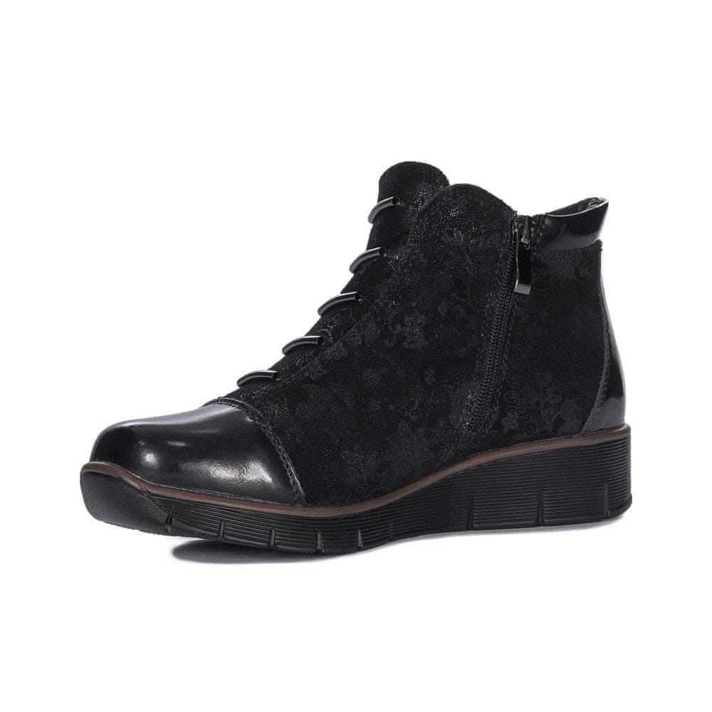 Gležnarji Filippo so popolna obutev za jesenske dni, ki odlično dopolnjujejo naš vsakdanji videz. Zgornji del s cvetličnim motivom v črni barvi je izdelan iz naravnega semiša in lakiranega usnja. Notranjost in vložek sta podložena z mehkim, prijetnim flisom na dotik, ki je zasnovan tako, da zagotavlja optimalno temperaturo naših stopal v zimskih dneh. Zadrga omogoča lažje in hitrejše menjavanje čevljev. Podplat je klinasta platforma iz visokokakovostnega materiala, dobro oblikovan in udoben. Vse podrobnosti se združujejo in ustvarjajo edinstven model čevlja, ki se bo odlično dopolnjeval s številnimi našimi stili. Če tega modela še nimate v svoji omari, ne odlašajte in naročite še danes. Kakovost I. Širina: G.