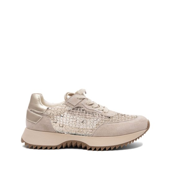 - Univerzalna bež barva, ki poudarja stil: bež ženski športni čevlji se dobro kombinirajo s svetlimi in temnimi barvami, kovinski vložek na peti pa doda faktor vau, ne da bi pretiraval.