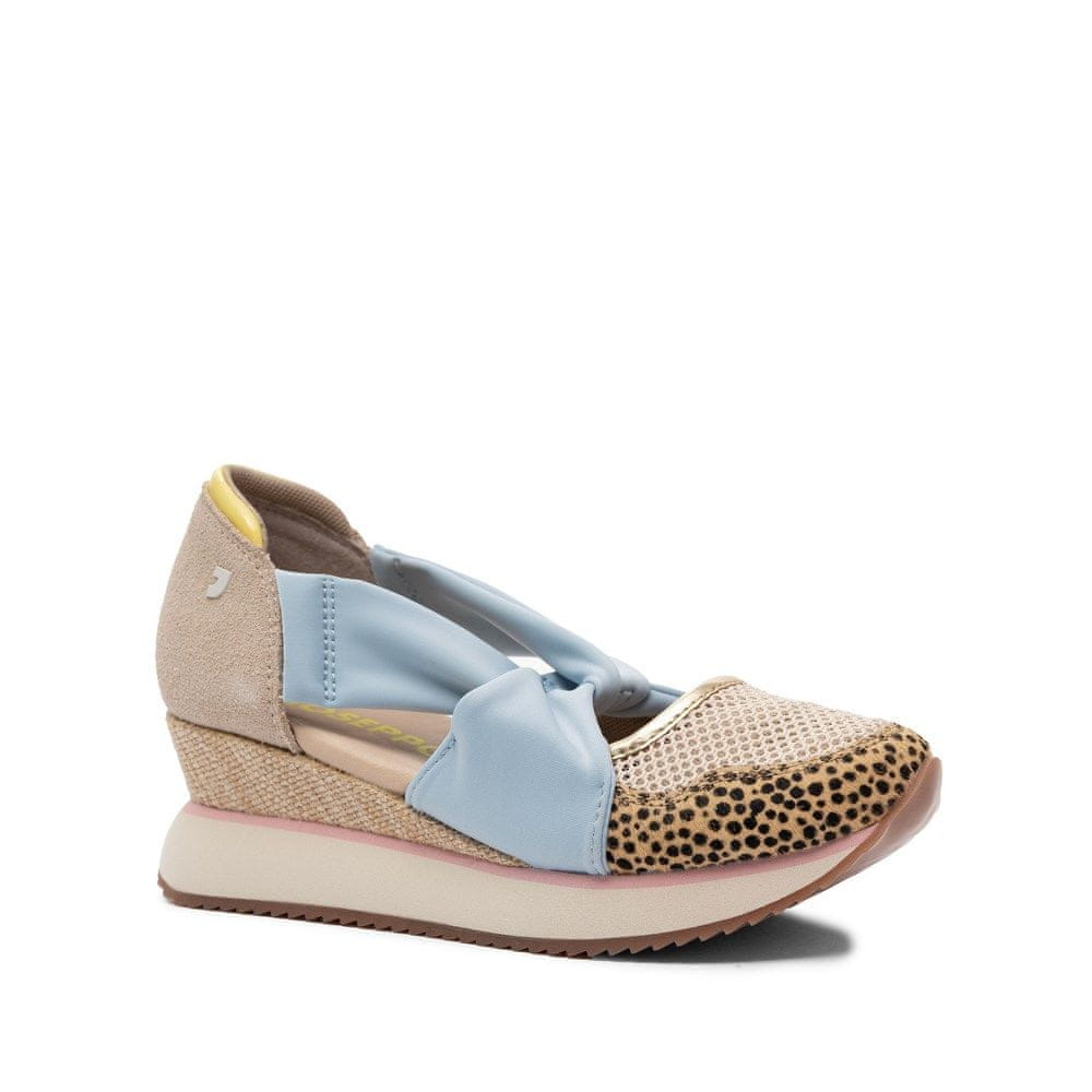 Iščete čevlje, ki takoj „dajo vtis“, hkrati pa so presenetljivo udobni? Odkrijte Gioseppo 78615-TARLAC-BLUE – večbarvne čevlje s klinastim podplatom, ki združujejo mehke, prepletene trakove na nartu z zračno mrežico na prstih in značilno zlato obrobo. Zaprta, bež peta iz mehkega materiala stabilizira stopalo, lahka platforma s pleteno teksturo in nazobčanim spodnjim delom pa doda sodoben, poletni pridih. Sprednji del krasi nežen leopardji vzorec, ki je v subtilnem kontrastu s pastelno modro črto in kremno mrežico – prav ta mešanica tekstur in barv daje tem čevljem svež, moden in zelo „poletni“ videz.