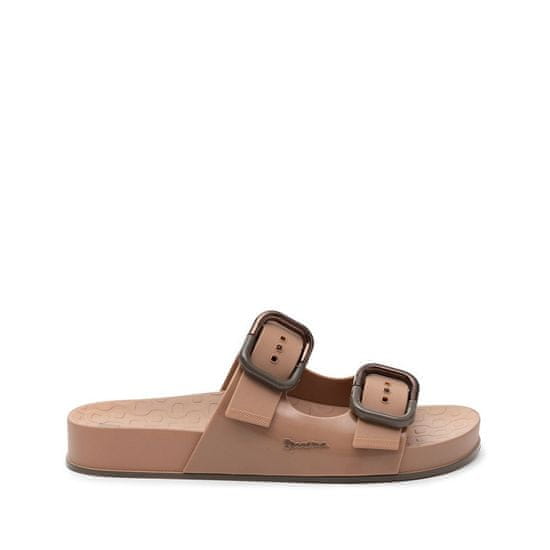 Iščete ženske japonke, ki jih lahko obujete zjutraj in … se jih ne boste želeli sezuti do večera? Rjavi model Ipanema je odgovor na vsa vaša poletna vprašanja „kaj imate danes na nogah?“. Dva široka paščka z vpadljivimi, velikimi zaponkami pritegneta pogled in celotnemu videzu dasta moden pridih, hkrati pa zagotavljata varen oprijem. Odprt, rahlo zaobljen prst omogoča svobodo gibanja, udobna 3 cm visoka platforma pa subtilno dvigne silhueto, ne da bi pri tem žrtvovala udobje. Te poletne japonke so videti kot prefinjen stilski element, a se nosijo kot vaša najljubša domača oprema – le v različici „za v mesto“.
