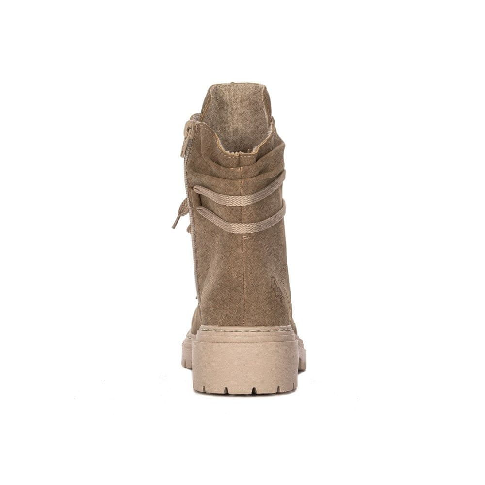 Najnovejša ponudba priznane nemške blagovne znamke Rieker je neverjetno udoben par ženskih gležnjarjev. Izdelani so iz visokokakovostnega bež materiala. Podloga je mehka na dotik. Zgornji del je vezalke, kar omogoča prilagajanje širine vašim potrebam. Zapenjajo se tudi z zadrgo. Okrogla konica daje vašim prstom veliko svobode in omogoča udobno namestitev stopal. Ti gležnjarji imajo nizko platformo in 5 cm visoko peto. Zelo modni, neverjetno udobni in se bodo odlično podali k številnim stilom.