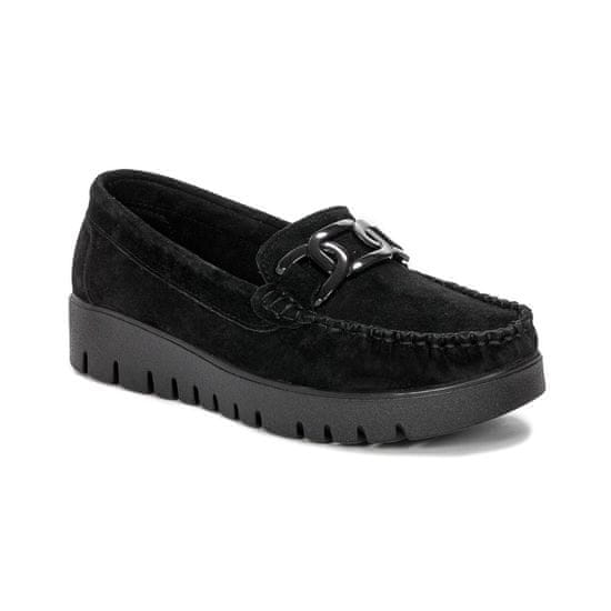 Obutev Filippo je predlog za zahtevne ženske, ki ne pričakujejo le odličnega videza, modnih stilov in privlačne barvne palete, temveč predvsem ergonomske rešitve. Predstavljamo elegantne čevlje v stilu mokasinov te blagovne znamke. Zgornji del je izdelan iz črnega semiš usnja, vložek je iz naravnega usnja, podloga pa iz blaga. Ta model ima okrogel prst in platformo z največjo višino 3,5 cm, višina sprednjega dela pa 2 cm. Čudovita črna kovinska dekoracija na sprednji strani. Kakovost: I. Širina: G.