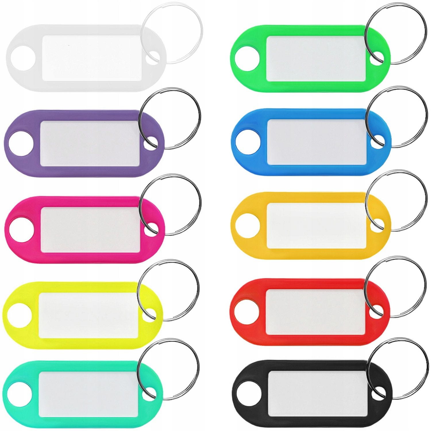 Žive barvne značke ključev (komplet vključuje mešanico barv) vam omogočajo, da hitro najdete komplet, ki ga potrebujete v torbici ali nahrbtniku. Tudi če imamo več kompletov, bomo v kratkem času zlahka našli tistega, ki nas zanima. Obeski z identifikatorjem za ključe imajo belo kartico z opisnim poljem, ki je dodatno zaščiteno s prozornim, plastičnim steklom . Na bel kartonček lahko vnesete več podatkov o namenu ključev (npr. številka omare, sobe ipd.), s čimer še lažje izberete ustrezen komplet ključev iz večjega kompleta.