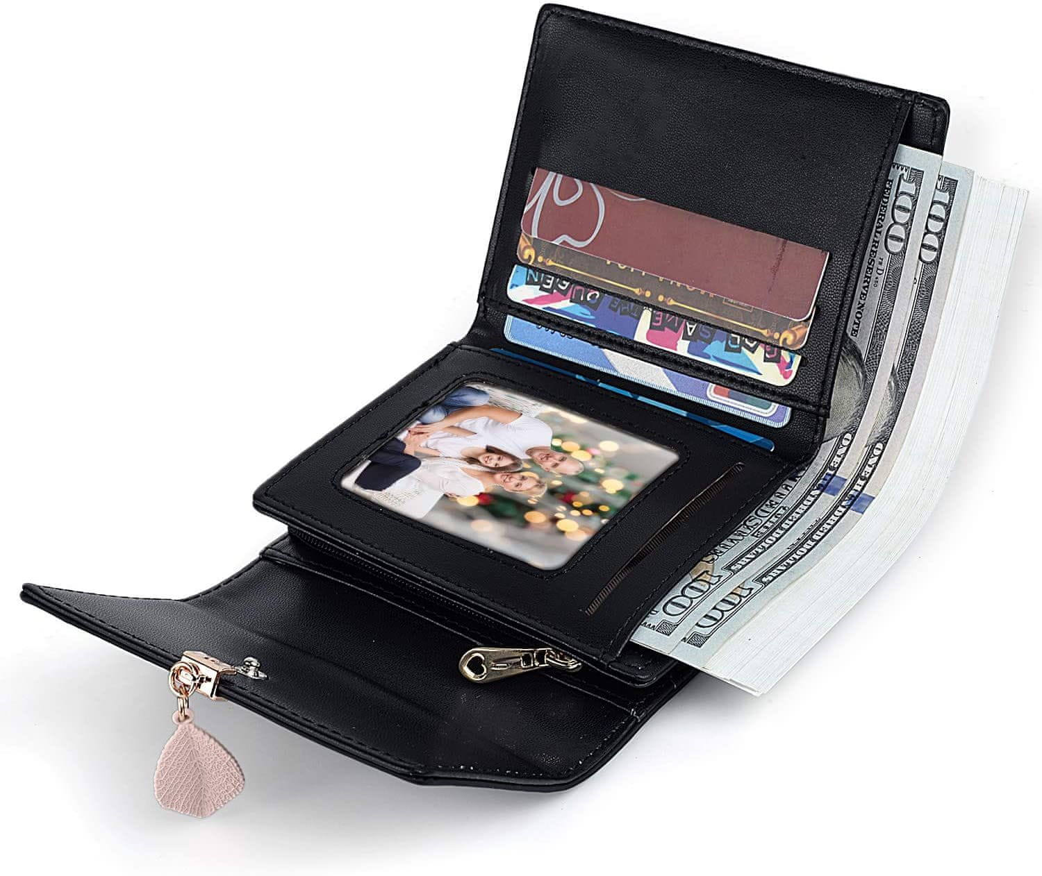 Denarnica je enostavne oblike, zlata sponka na drobižniku ji doda eleganco, listek na sprednjem delu pa preprostost. Velikost denarnice je 11 × 10 cm, kar pomeni, da je v njen čisto dovolj prostora.