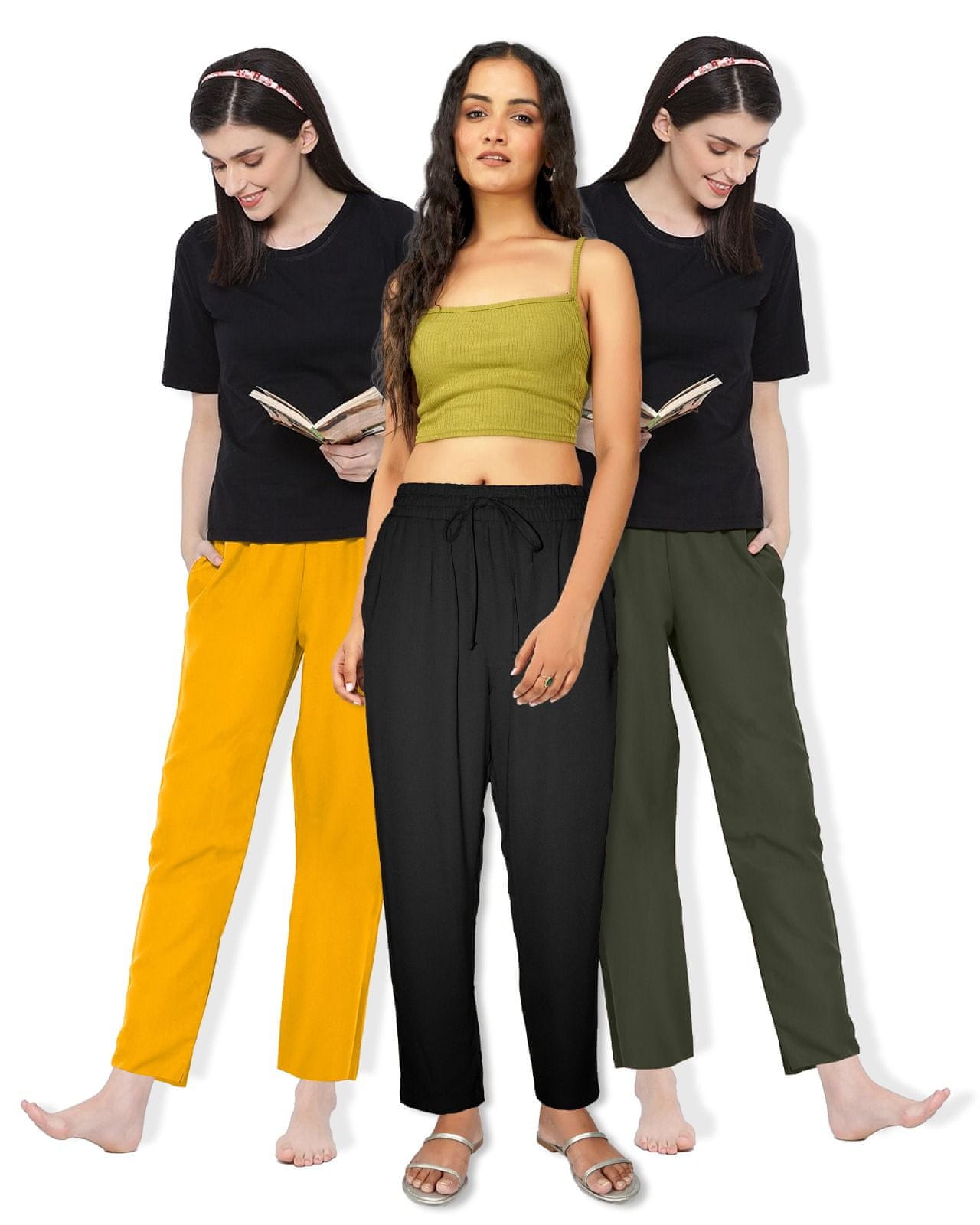 PANTONECLO Ženske hlače iz poliestra (Rumena + črna + olivno zelena) - Paket 3 kosov, 14