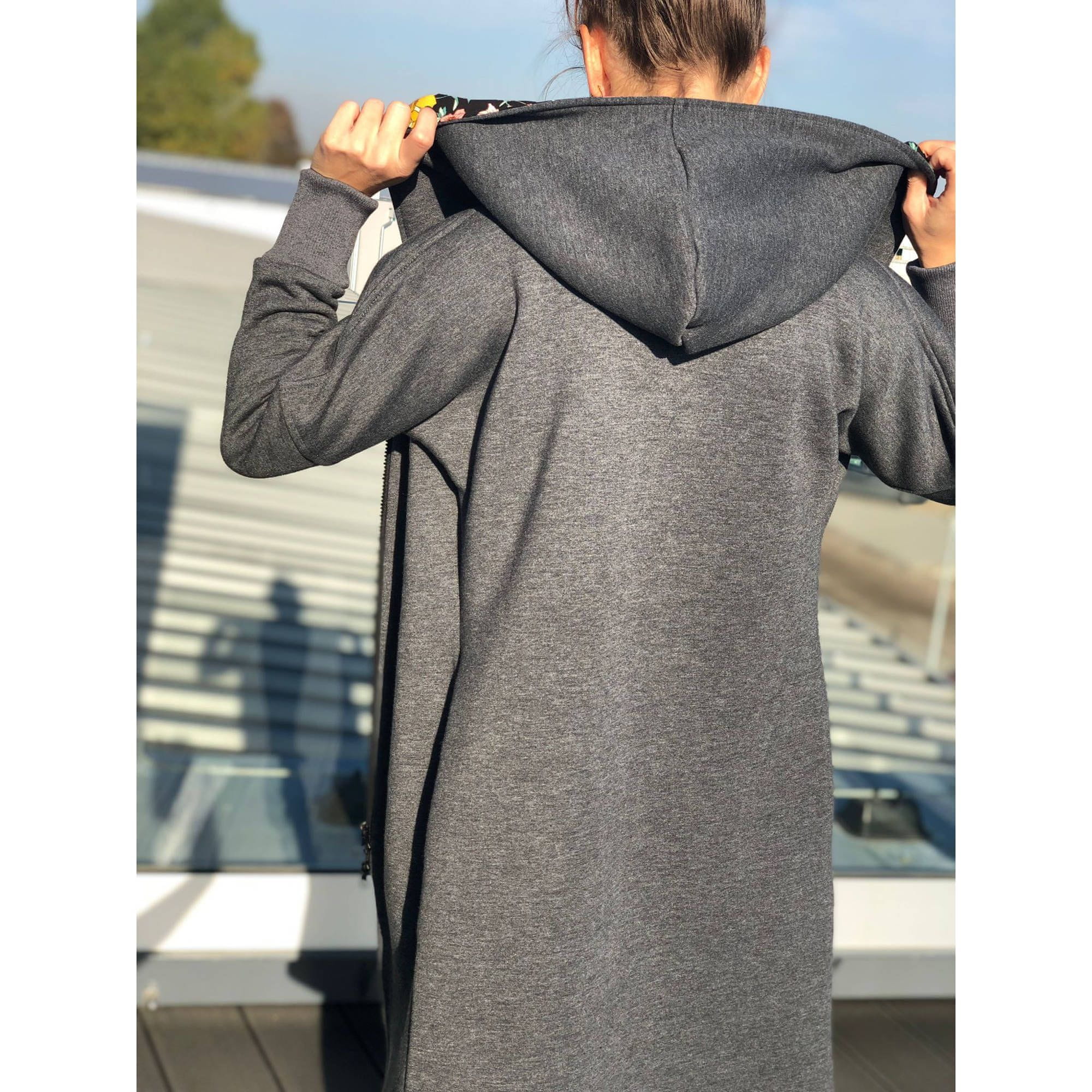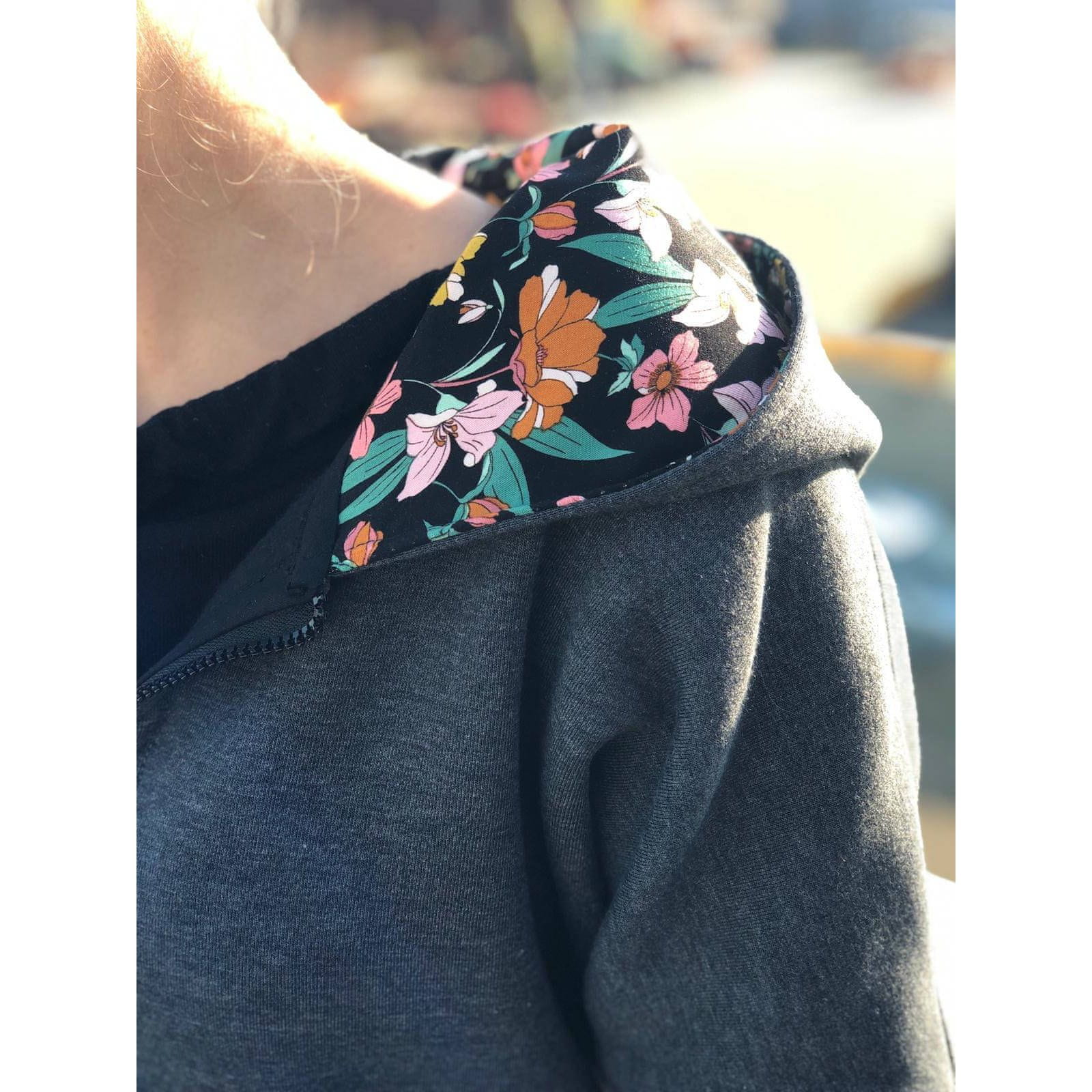 Naša obvezna oprema za jesen in zimo je siva majica s cvetličnim potiskom na notranji strani kapuce in žepov.