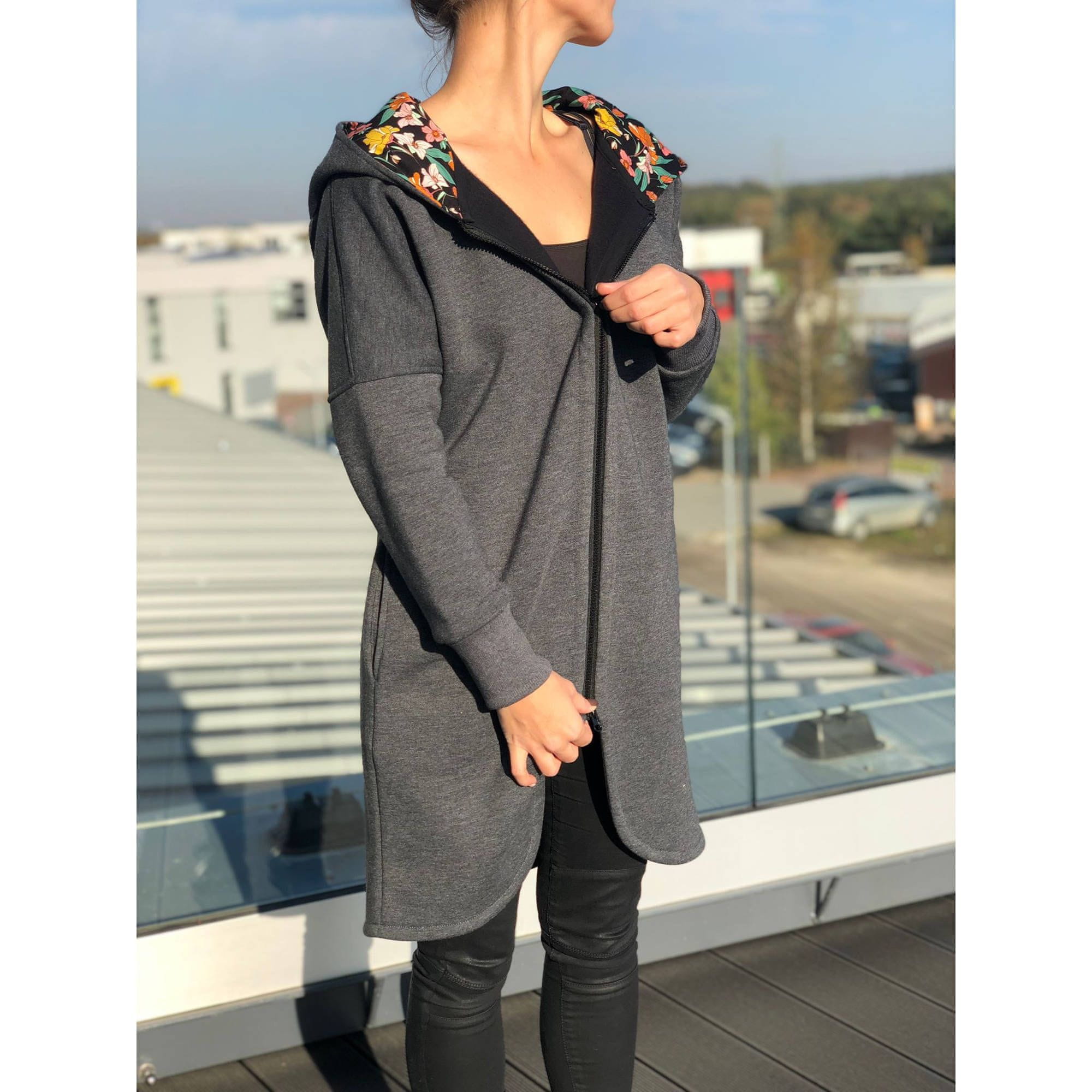 Mikina z nordijskimi cvetovi, ki jo je izdelala Zusska. Naša obvezna oprema za jesen in zimo je ta siva jopa s cvetličnim potiskom na notranji strani kapuce in žepov. Celoten opis