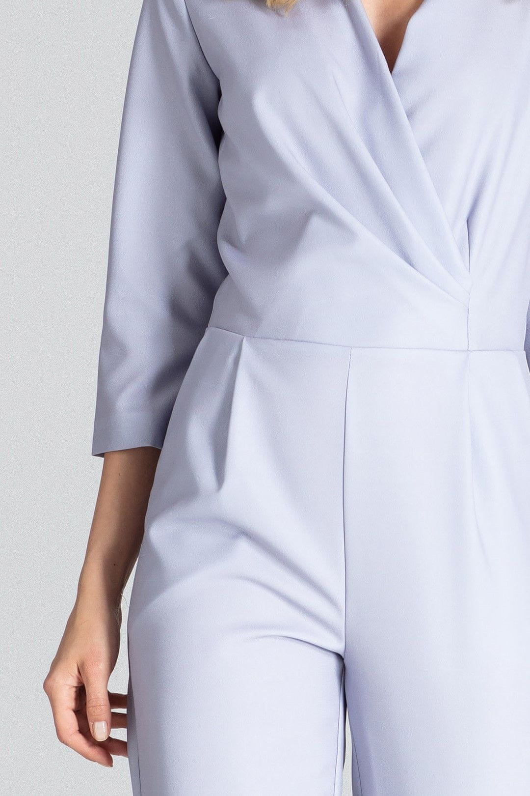 Popis:Siva kombinezonska obleka z ovojničnim izrezom, 3/4 rokavi in všitimi gubami v pasu. Stranska poševna žepa. Zapenjanje z zadrgo na hrbtu.Materiál: 100% poliester
