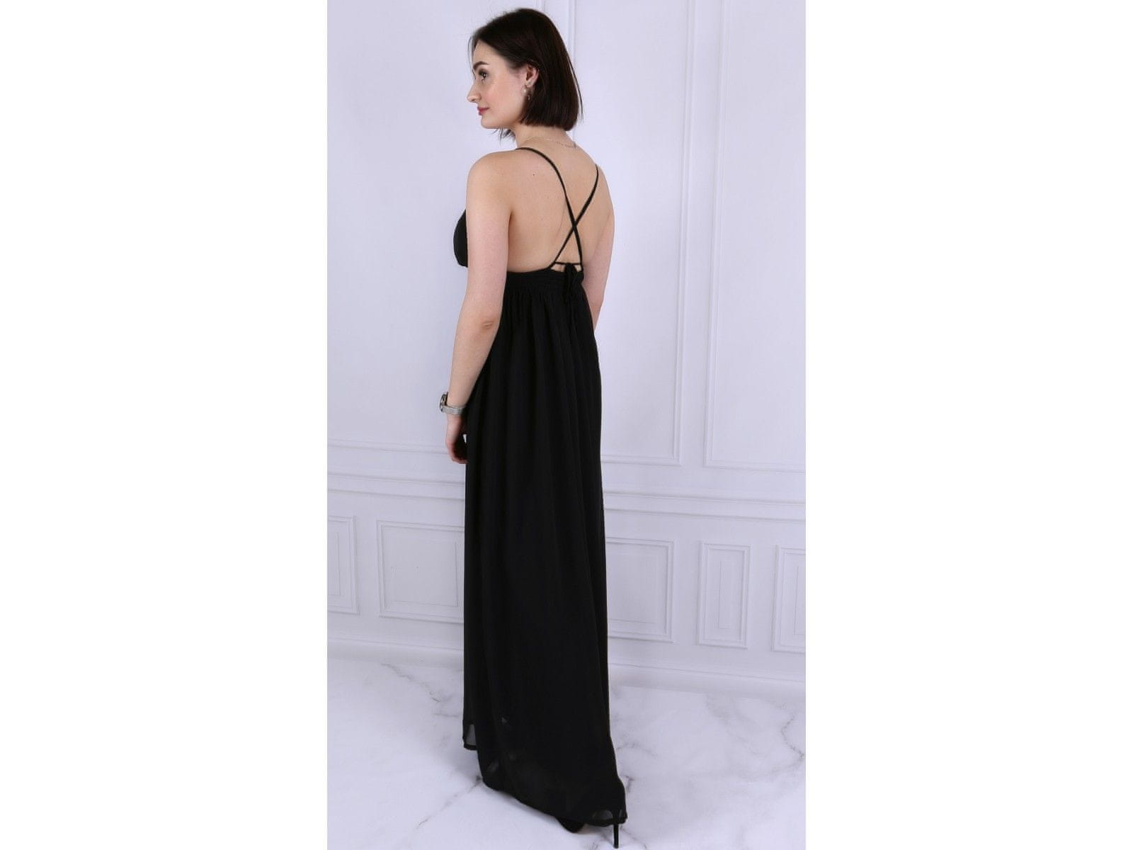 Dolga, lahkotna črna obleka iz šifona.Ima tanke naramnice, prekrižane na hrbtu, z možnostjo nastavitve, ter globok izrez.Obleka je popolna izbira za vroč poletni večer.Velikosti oblačil so standardne. Celoten opis