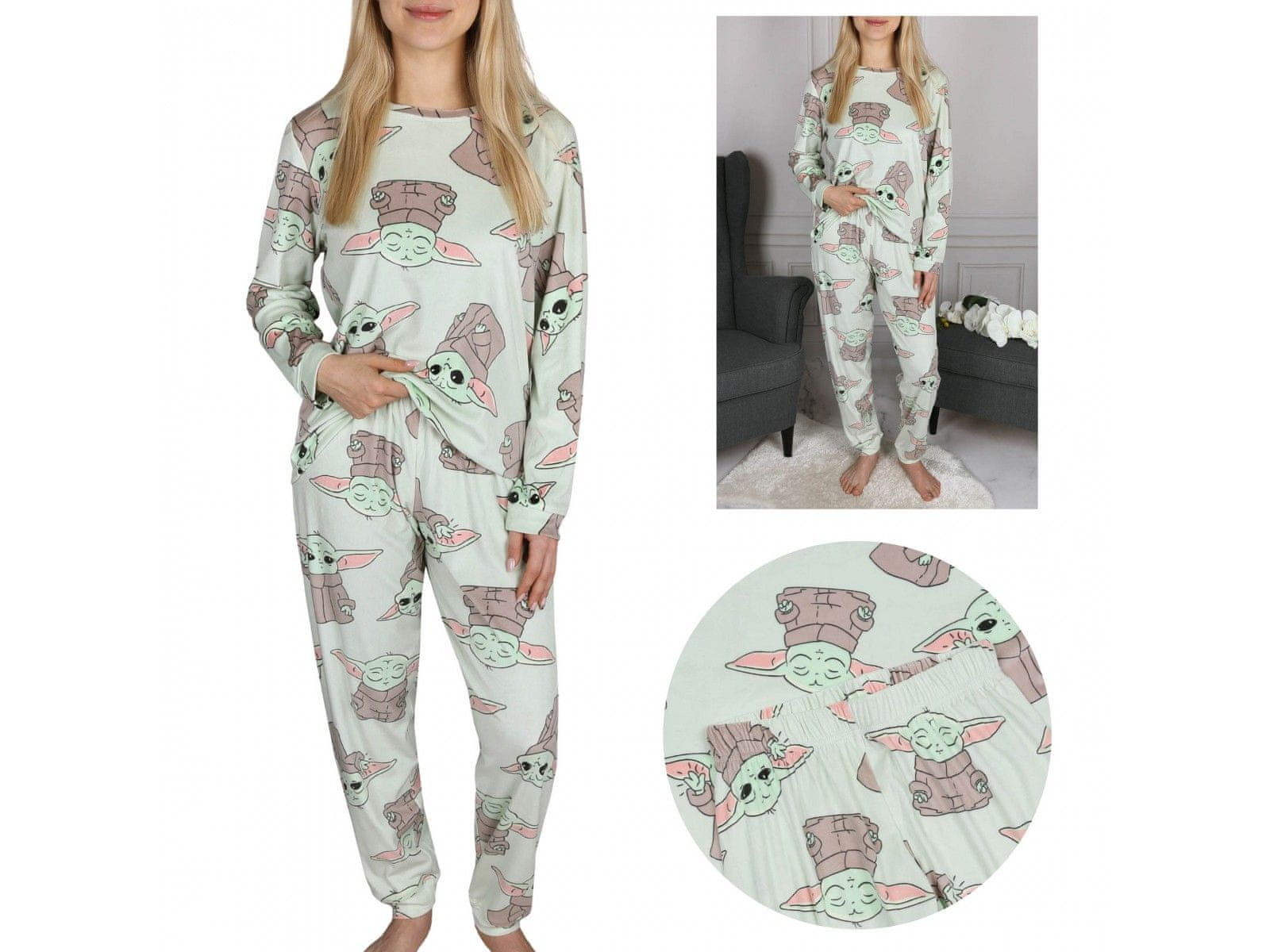 Ženska pižama iz velurja z motivom Disney Baby Yoda je odlična izbira za ljubitelje kultne sage.Izdelana je iz mehkega, svetlo zelenega velurja in zagotavlja udobje in toploto v hladnejših večerih.Dolgi rokavi in ohlapen kroj zagotavljajo svobodo gibanja in udobje med spanjem.Simpatična oblika z lik Celoten opis