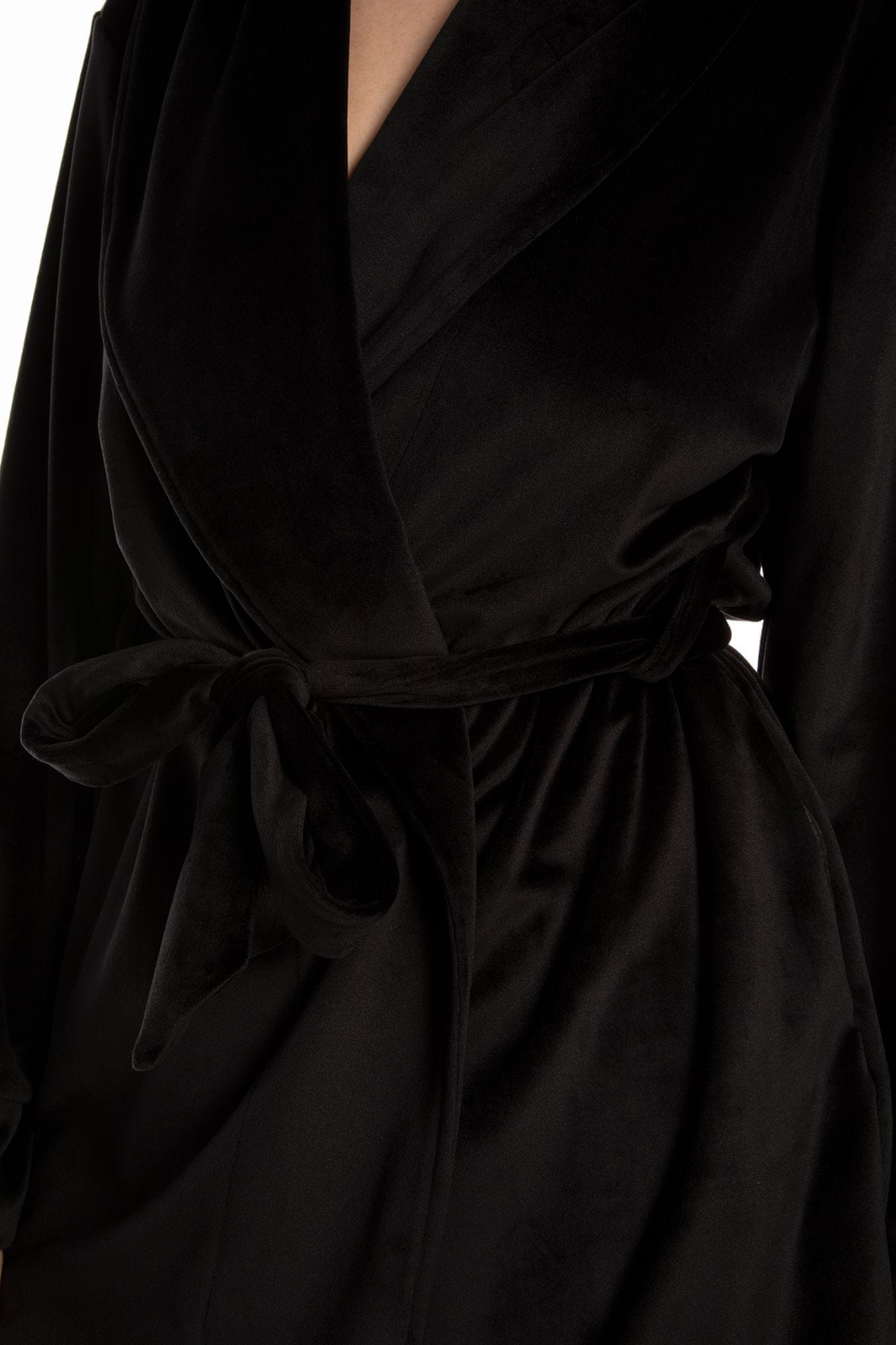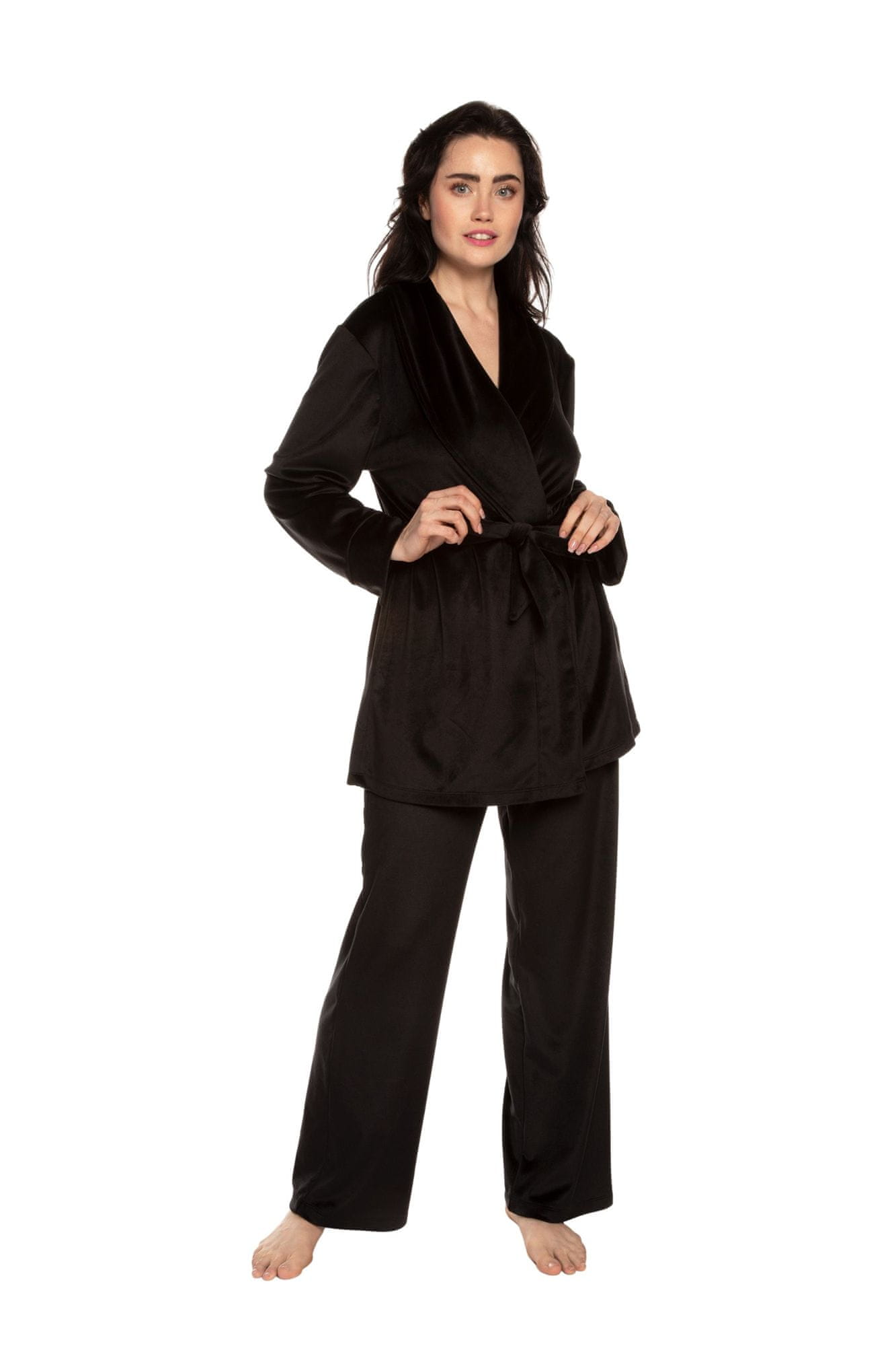 Ženski domači komplet iz velurja v črni barvi, sestavljen iz kratke halje in dolgih hlač. Zaradi nastavljivega pasu in razkošne tkanine iz velurja je ta komplet popoln za večerne izhode doma. Velur – blago ima svetel in poseben sijaj, zelo mehko in prijetno v stiku s kožo. Izdelki iz velurja se ne mečkajo, kar je dodaten bonus pri uporabi. Ta izdelek je posamično pakiran! Eko vrečka za večkratno uporabo. Zaradi tega so izdelki Effetto odlična izbira kot darilo ljubljeni osebi in dodajo še posebej prijetna čustva ob nakupu.