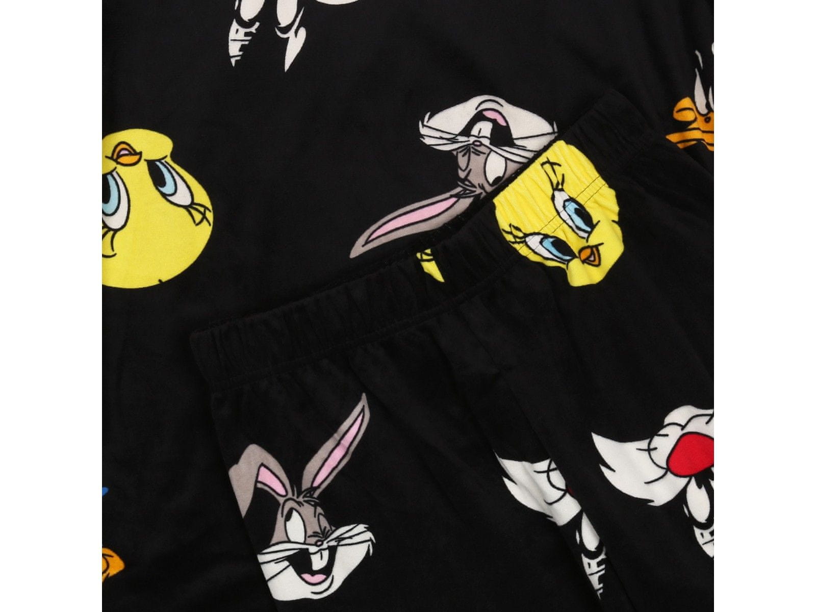 Črna, dolga dvodelna pižama z motivi junakov iz animiranega filma „Nore melodije“.Pižama ima dolge rokave in dolge hlače, ki so zaključene z manšetami, ter majico z okroglim izrezom.Komplet je narejen iz mehkega, zelo raztegljivega, tankega flisa, ki omogoča, da koža prosto diha.Ta pižama je idealna Celoten opis