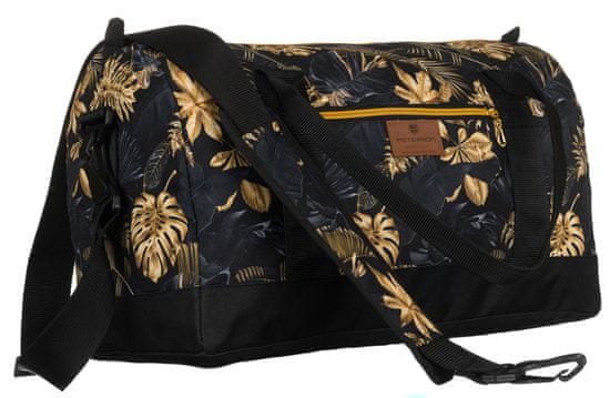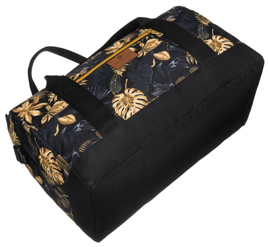 A senzacionalna potovalna torba iz odličnega materiala, z živim botaničnim vzorcem. Vsi njeni elementi so v črni barvi, ki je v popolnem kontrastu z barvo materiala.