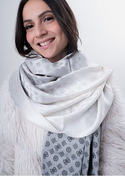 Nežen šal z gladkim barvnim prehodom. Vzorec, sestavljen iz majhnih ikoničnih motivov. Celoten opis