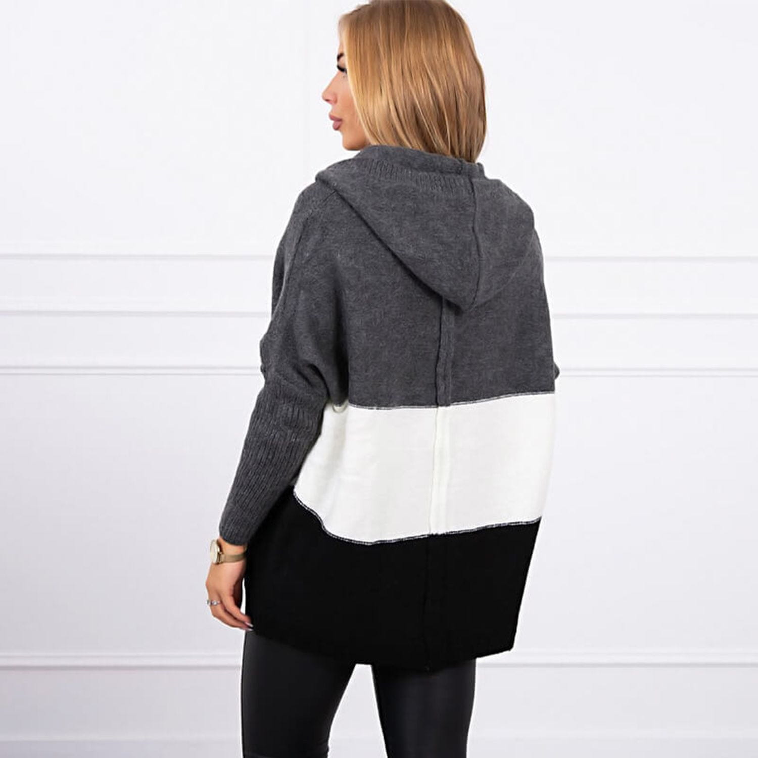 Modna tribarvna jopica z nežnim tkanjem poskrbi za sproščen in hkrati eleganten videz. Je srednje dolžine in ima kapuco. Izdelana je iz kvalitetnih materialov, ki zagotavljajo prijetno nošenje. Velikost je univerzalna in je primerna za dame in punce, ki nosijo velikosti M, L, XL. Dobavljiva je v kombinaciji grafitne, črne in bele barve.