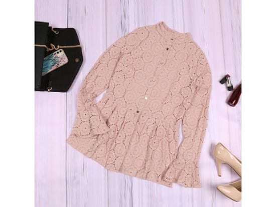 Bluza, prikazana na sliki, je svetlo bež barve, izdelana iz čipkastega materiala z okroglimi vzorci. Ima dolge rokave, ki so rahlo razširjeni pri zapestjih, in subtilne zlate gumbe, ki potekajo spredaj. Kroj je rahlo razširjen v spodnjem delu, kar ji daje nežen, ženstven videz. Bluza je videti popolna za elegantne priložnosti, pa tudi za vsakodnevne kombinacije.