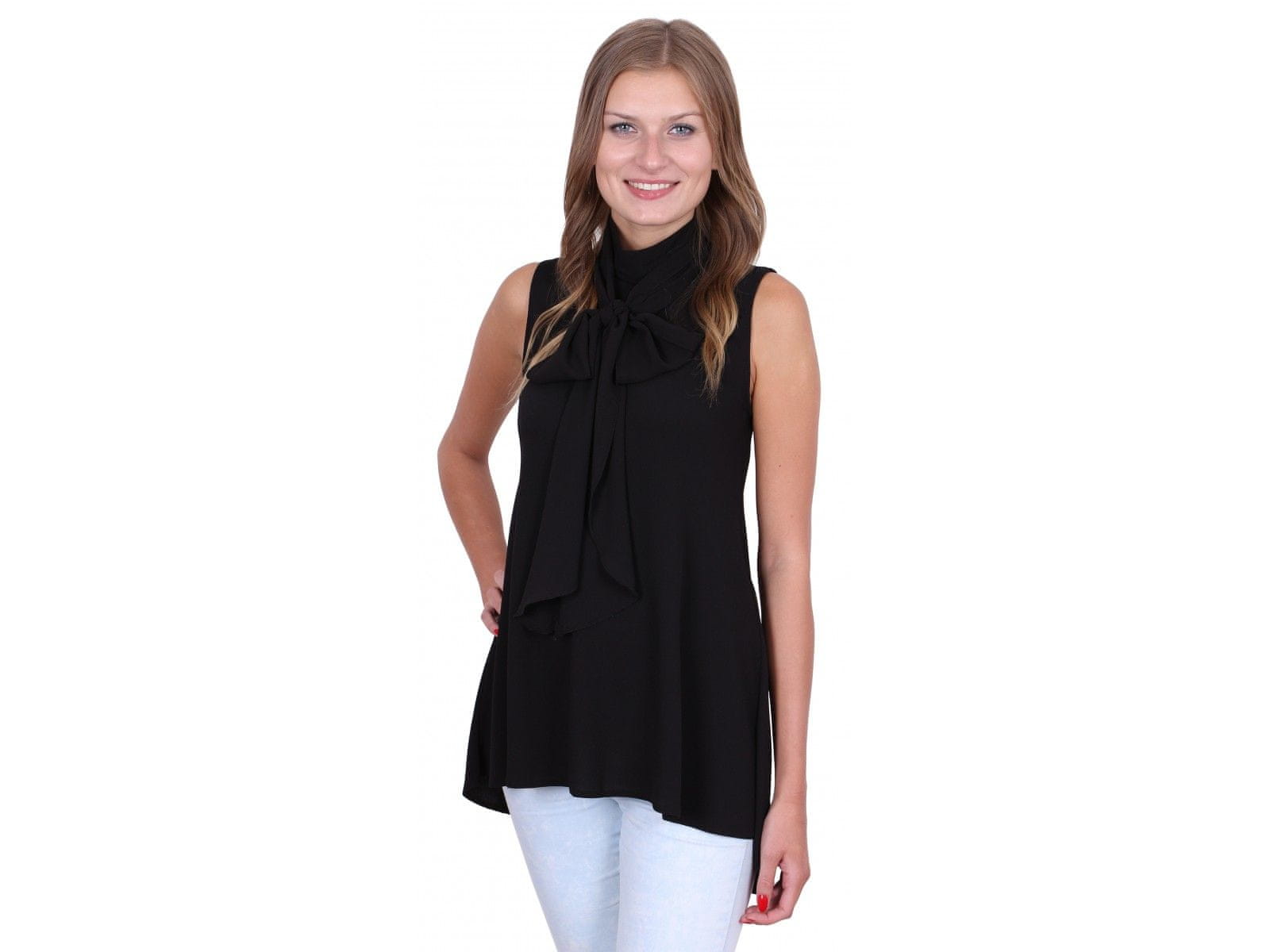 Črna brezrokavna bluza z okrasnim zavezovanjem.