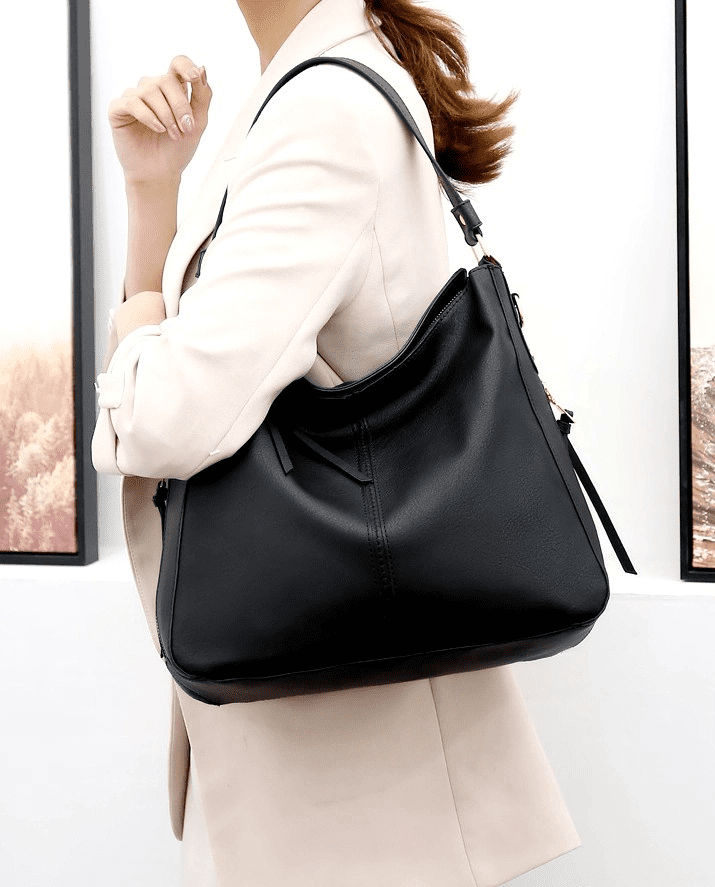 Odkrijte elegantno in prostorno črno torbico „Črna prostorna usnjena torbica Large Shed“, izdelano iz kakovostne ekološke usnje. Njen premišljen dizajn z izvirnim zlatim okovjem združuje modni slog in praktično funkcionalnost. Torbica je razdeljena na dve polovici z veliko zadrgo in ponuja tudi varno žepno zadrgo za osebne dokumente, pa tudi dve manjši žepki za ključe ali robčke. Od zunaj boste našli še tri zadrgane žepke, ki zagotavljajo enostaven dostop do potrebnih stvari.