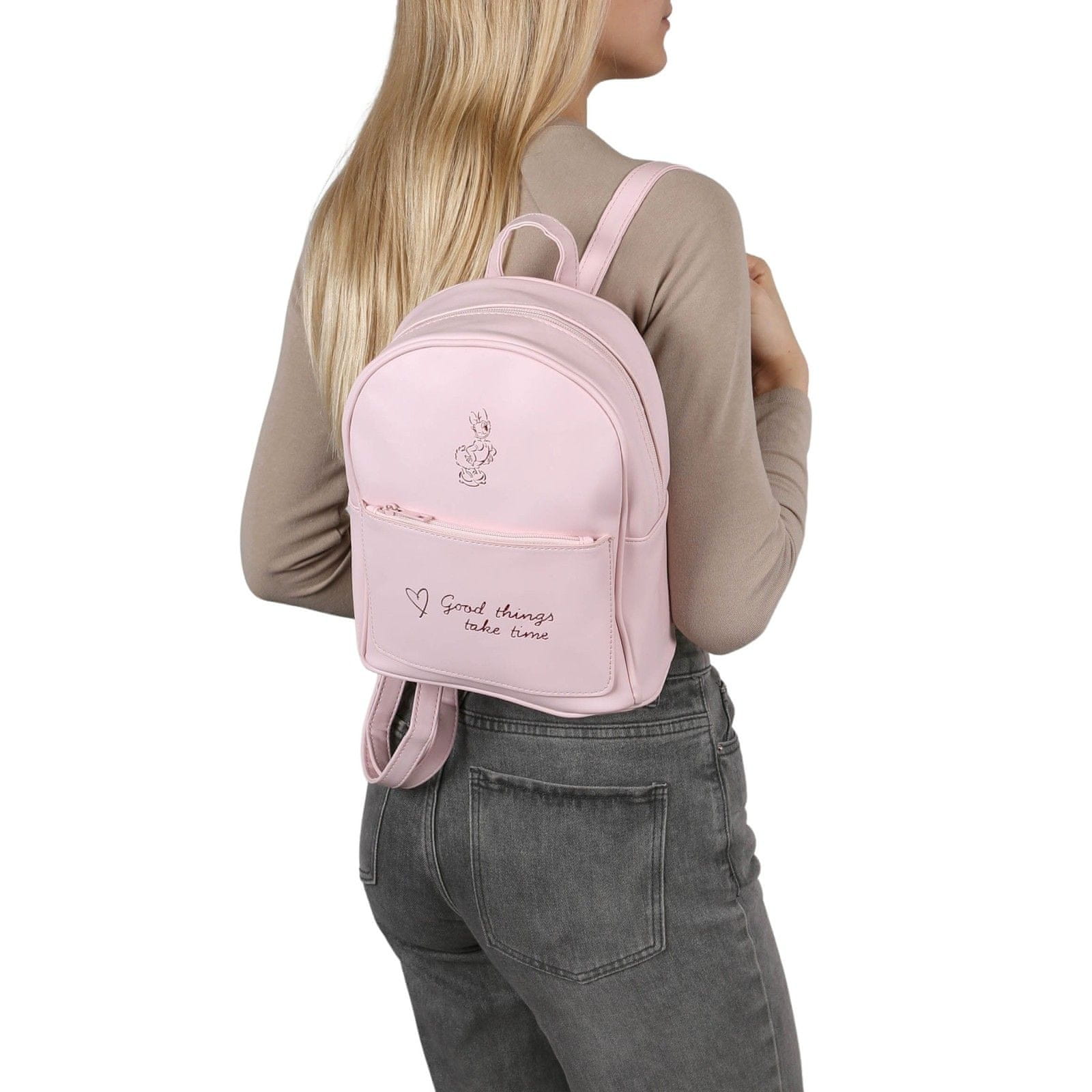 Na sprednjem žepu so elegantne besede „Good things take time“ in subtilna risba Daisy, ki nahrbtniku dajejo dekliški pridih.