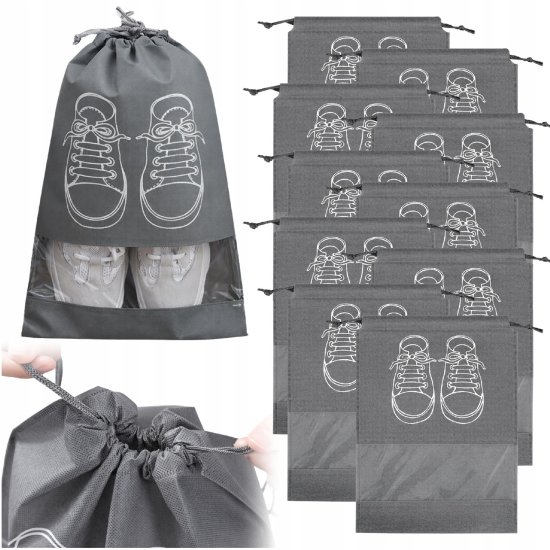 Izdelane so iz lahkega, a vzdržljivega materiala, primernega tako za potovanja kot za domače shranjevanje sezonske obutve. Zapiranje z vrvico in stoperjem omogoča hitro zapiranje ter varno prenašanje, dodatna zanka/ročaj pa olajša uporabo v garderobni omari, na poti ali v telovadni torbi. V kompletu prejmete 10 kosov, kar zadostuje za organizacijo celotne prtljage družine ali za daljše potovanje. Univerzalna velikost omogoča uporabo tudi za shranjevanje oblačil, perila ali dodatkov, ko želite v kovčku vzpostaviti več reda in lažje najti iskane stvari.
