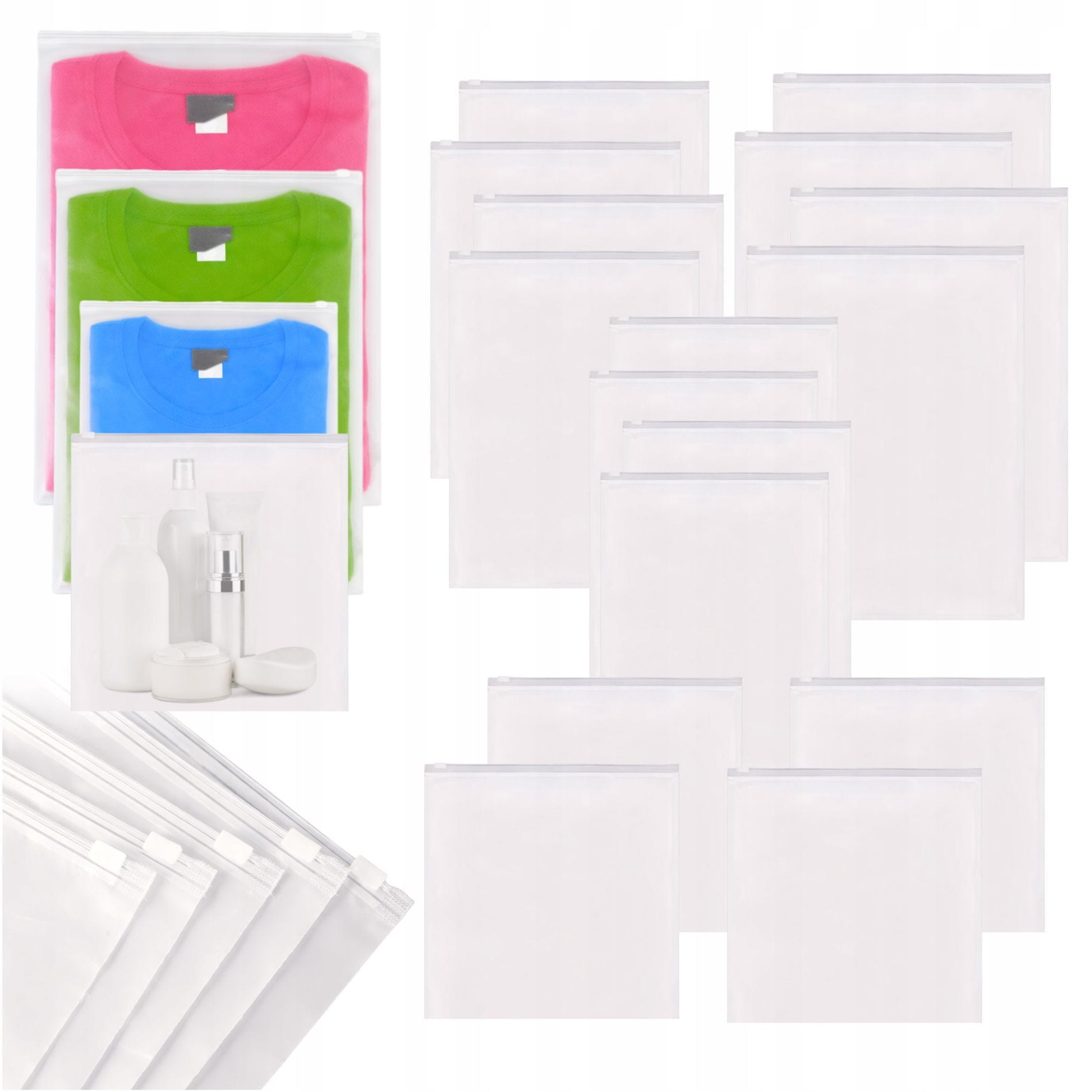 - V tem primeru je treba zagotoviti, da se v primeru, da je v kompletu 16 vrečk, 4 različne velikosti za vsestransko organizacijo – ločevanje oblačil in obutve za večjo čistočo v prtljagi – zaščita pred prahom in umazanijo, primerne tudi za shranjevanje doma – vodoodporen, lahek in vzdržljiv material – polprosojna zasnova s prozornim okencem za boljši pregled – zip (strunsko) zapiranje za hitro in varno uporabo Tehnični podatki:
