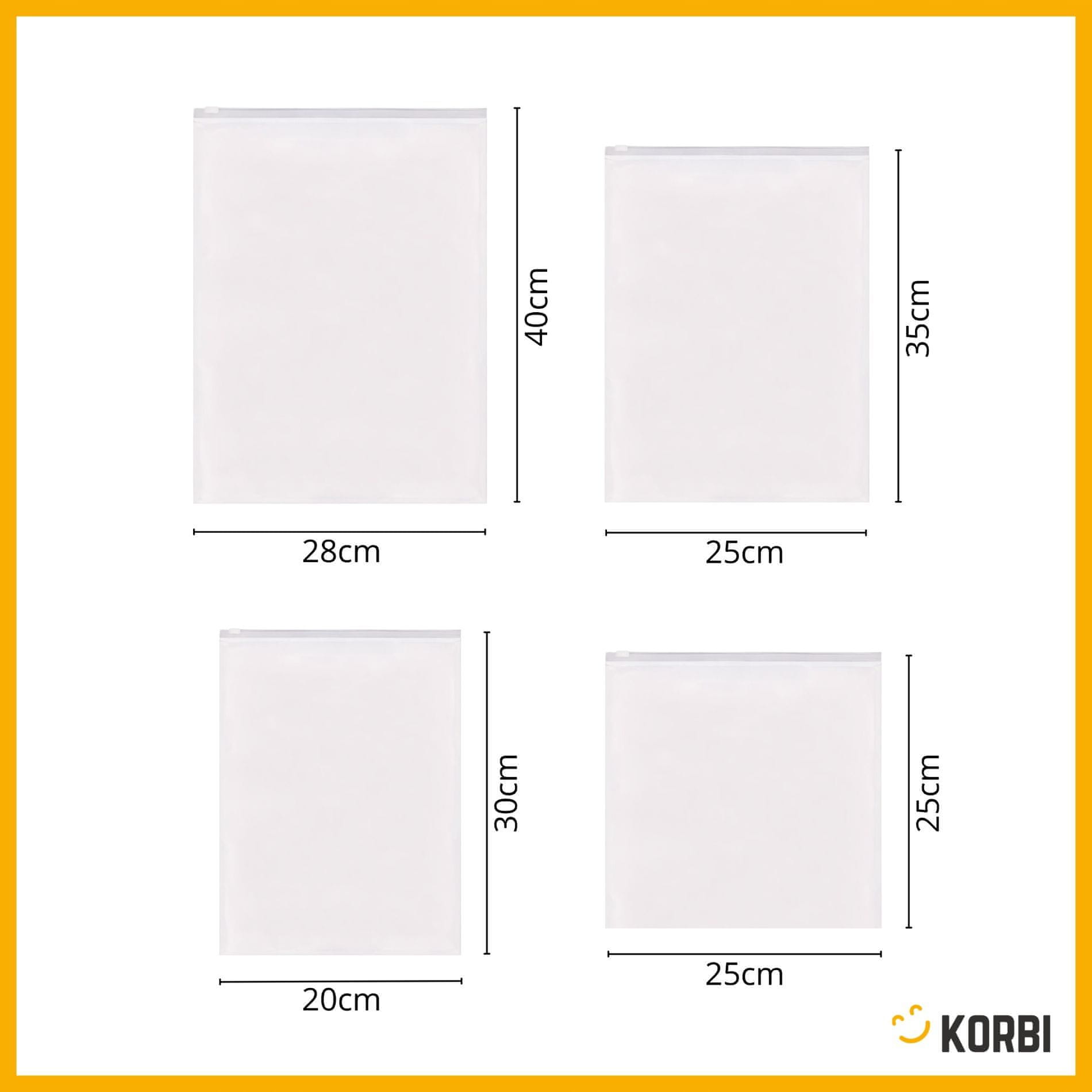 - Vrsta: potovalni organizacijski vrečki (sack) – količina: 16 kosov – velikost: 4 različne – barva: polprosojna – zapiranje: zip (zip) – dodatne lastnosti: prozorno okence, vodoodpornost – znamka: Korbi – EAN: 5906448710400.