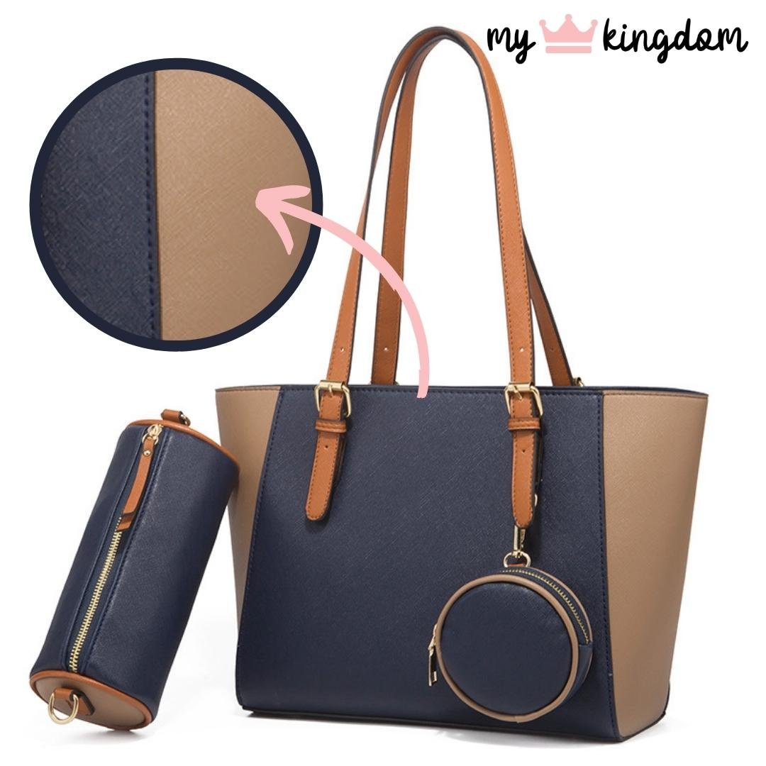 Modne torbice Kiwi 3-delni set vključuje torbico, manjšo okroglo torbico in torbico za ličila. Komplet je na voljo v več barvnih kombinacijah, ki se ujemajo z moderno linijo. Zlati dodatki in kvalitetno umetno usnje dodajajo torbici živahnost in eleganco. V notranjosti torbice se nahaja en velik žep, ki se zapira z zadrgo, ter dva manjša žepa.