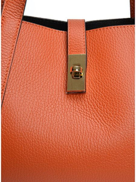 Elegantna usnjena torbica v oranžni barvi z zlatimi podrobnostmi. Zapiranje z vrtljivim zaklepom. Celoten opis