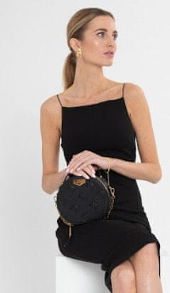 Opomba Ženska črna torbica, glavni žep z zadrgo, nastavljiv in snemljiv pas za čez ramo, okrašena z zlatim snemljivim pasom z verigo, logotip na sprednji strani, z zlatimi elementi. Celoten opis