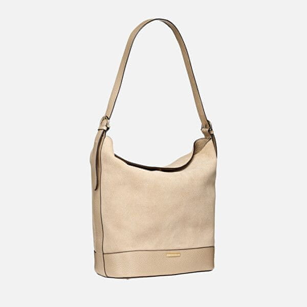 Ženska torbica v nežni bež barvi z elegantnim minimalističnim videzom. Kombinacija semiš površine in gladkega usnja, ki ustvarja zanimiv kontrast materialov. Celoten opis