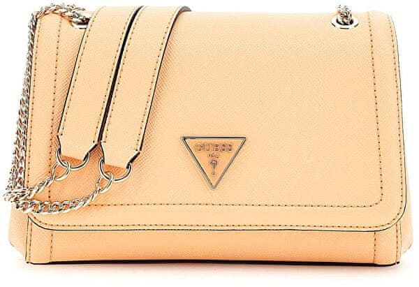 Ženska torbica čez ramo marelične barve. Dopolnjujejo zlati detajli. Celoten opis