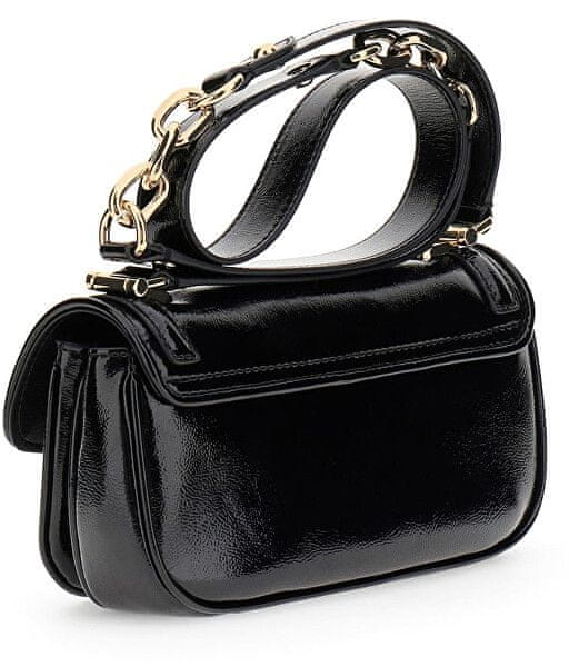 Luksuzna črna Guess torbica iz sijočega materiala. Elegantna oblika z zlatimi kovinskimi detajli. Celoten opis
