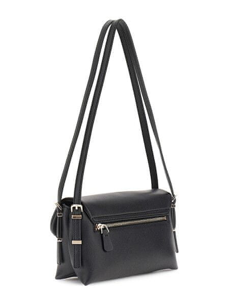 Elegantna torbica v črni barvi z gladko površino. Zapiranje z magnetom in zlatim okraskom z logotipom Guess. Celoten opis