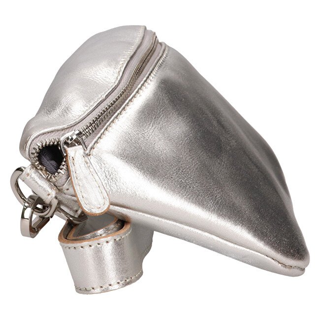 Opomba Damska usnjena ledvična torbica, srebrne barve, notranji in zadnji žep na zadrgo, glavni žep na zadrgo, nastavljiv in snemljiv naramni trak. Celoten opis