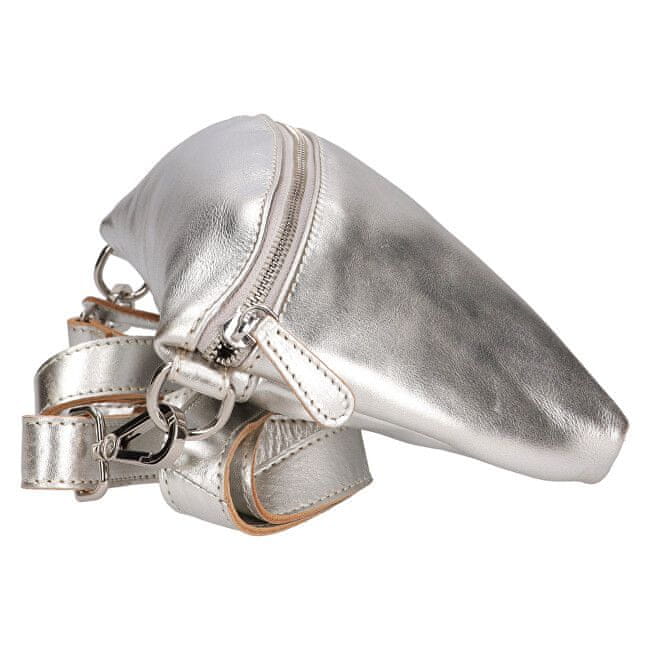 Opomba Damaška usnjena torbica za ledvičke, srebrne barve, snemljiv naramni trak, glavni žep z zadrgo, zadnji in notranji žep z zadrgo. Celoten opis