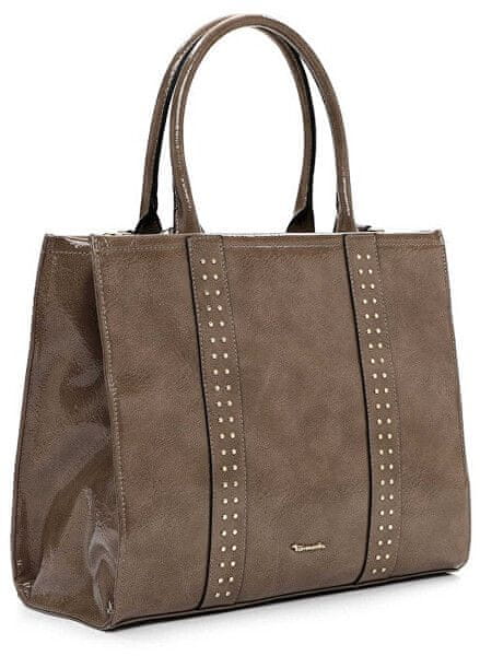 • Moderna nakupovalna torbica z lakirano površino in subtilnimi okrasnimi čepki na sprednji strani,