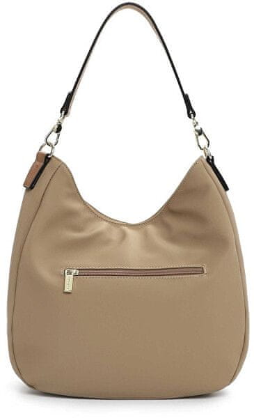 Prostorna ženska torbica v svetlo bež barvi. Kontrastni rjavi detajli na ušesih in zadrgah. Celoten opis