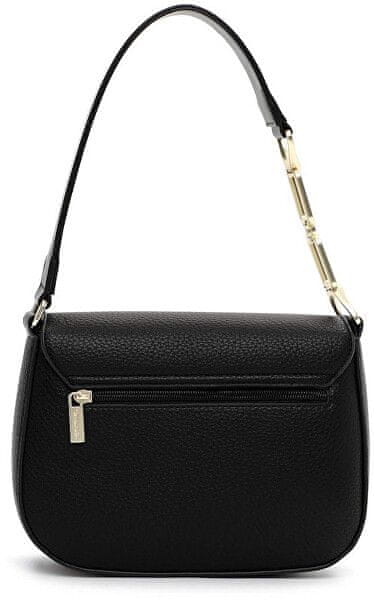 Elegantna torbica v črni barvi s fino površinsko strukturo. Kratek, trden naramni trak, okrašen z zlatimi členki. Celoten opis