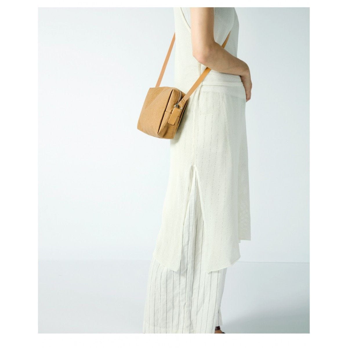 Modna torbica za čez ramo iz trpežnega pralnega kraft papirja in usnjenim trakom in notranjo oblogo iz tkanine.
